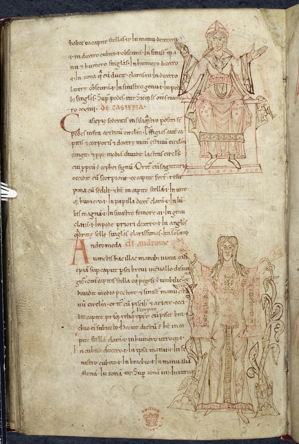 London, British Library Cod. Royal 13 A XI, fol. 106 v: French medieval manuscript page with Casiepia enthroned and Andromeda bound