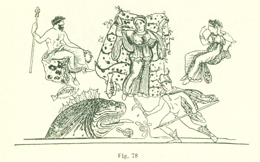 The hideous monster now drew near, and would have swallowed her [Andromeda]: but the youth [Perseus], hovering above, smote him with the drawn scimetar in his right hand, and with his left uncovered the petrifying Gorgon’s head: in one moment the monster was lifeless; all of him that had met that gaze was turned to stone (original Greek).